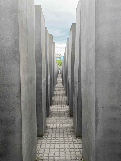 - Holocaust Memorial: I'd previously seen pictures of this one online. It's a 200,000 square foot site with 2,700 rectangular pillars, each about 7'9" by 3', from 8 inches tall to over 15 feet tall, arranged in a big grid like a city, generally from shortest to tallest front to back. You can wander throughout the monument, as the passageways are about 2 feet wide between them. One of the ironic pieces of information our guide gave us (which I have not been able to verify independently) is that the blocks are painted with graffiti repellant paint. That's not the ironic part. The ironic part is that the paint was developed by a company named Degussa... one of their subsidiary companies was the main manufacturer and distributor of Zyklon B, the gas used in the extermination chambers. I found that ironic.