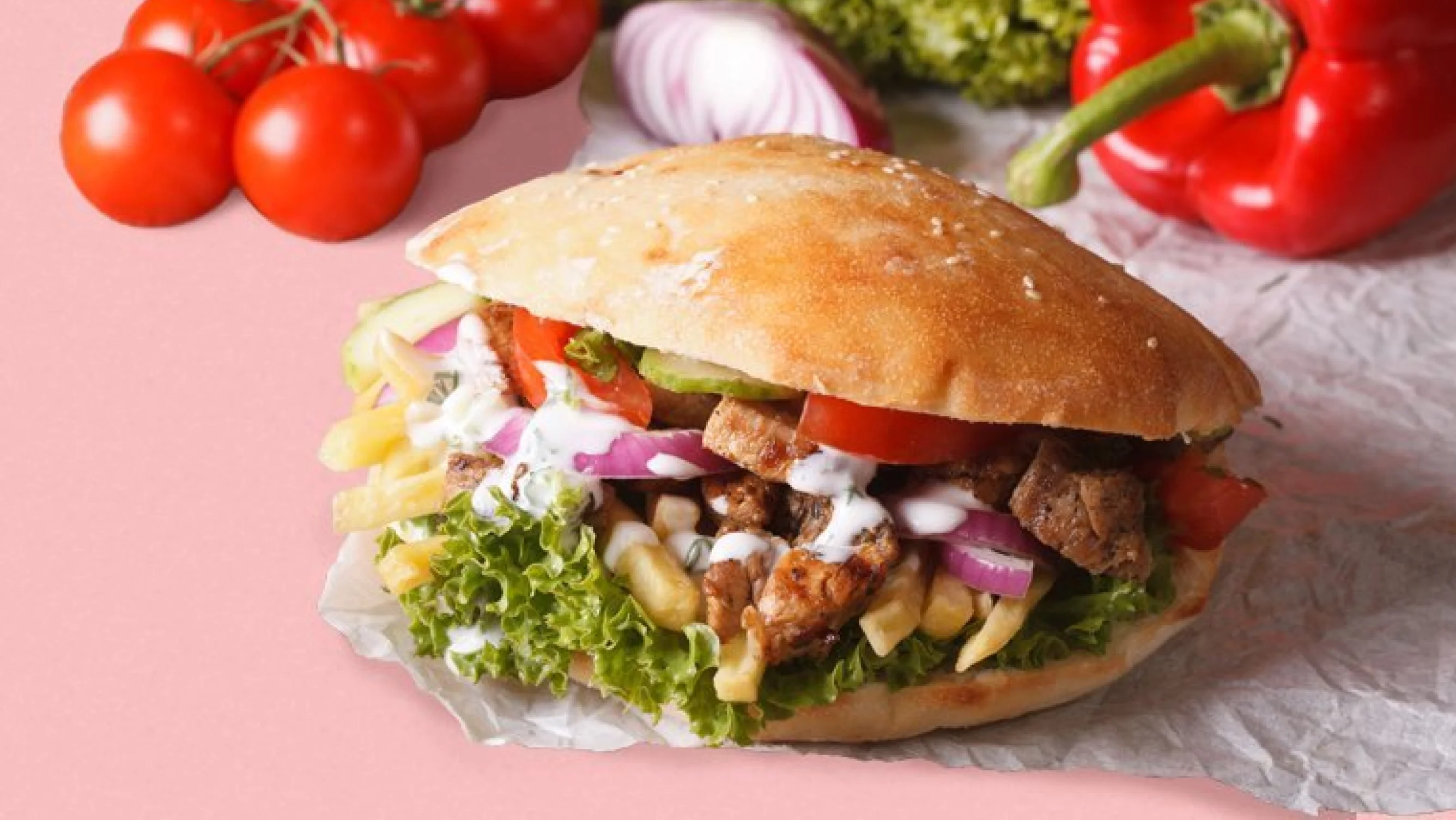 They pile that meat into a pita that's usually (but not always) sliced open, and fill the rest of the pocket with lettuce, onions, cabbage, tomatoes, and a cucumber flavored yogurt-ish sauce called tzatziki. Here's what the sandwich generally looks like: